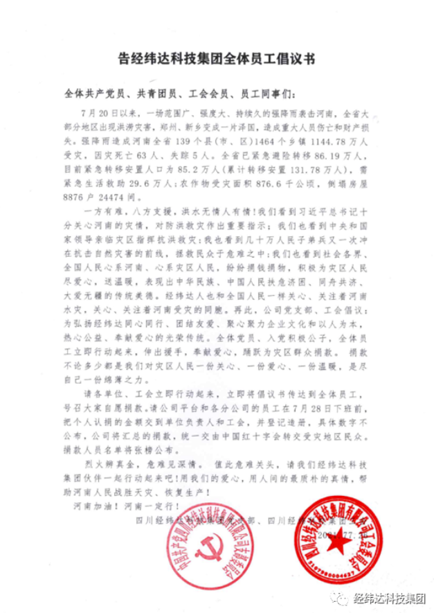 在河南灾情发生后,经纬达科技迅速响应并发出《告经纬达科技集团全体员工倡议书》组织向灾区捐款,在倡议书发出后经纬达的员工们踊跃捐款。